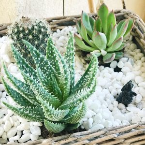 Créer un petit coin de paradis pour les plantes grasses : récupérer un petit panier, acheter des plantes (environ 2-5 euros l’unité), un peu de terre et des jolis petits cailloux blancs.