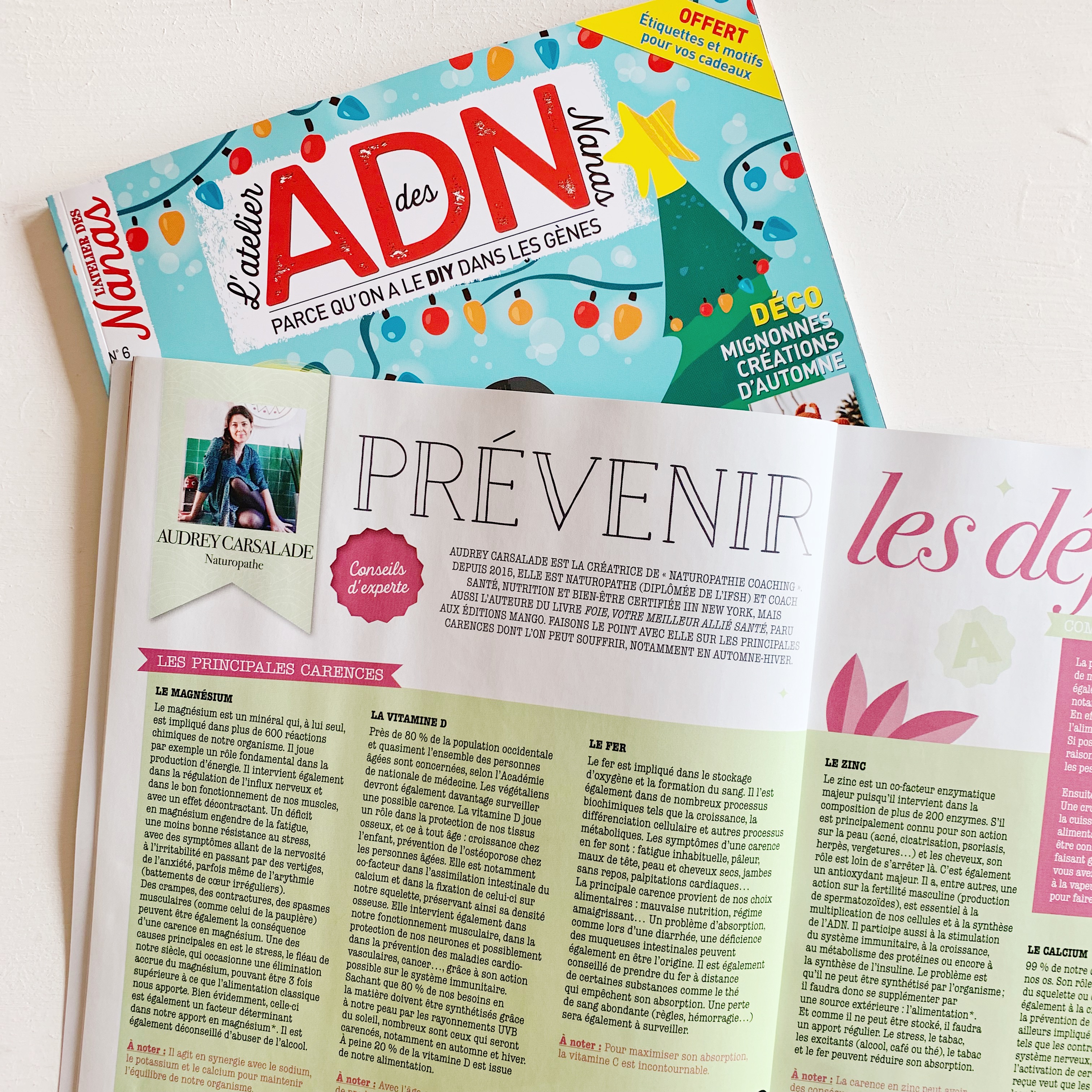 Parution dans le numéro 6 d'ADN Magazines : les principales carences et comment y remédier avec des méthodes naturelles grâce à la naturopathie.